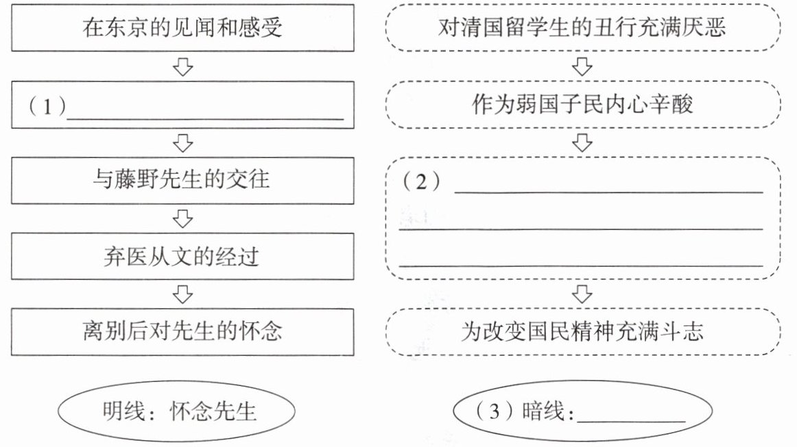 2. 这篇回忆性散文表达了作者对藤野先生真挚的怀念。作者在叙述的过程中,除了回忆藤野先生这条明线外,还有暗线。请精读文章,把下面的结构图填补完整。