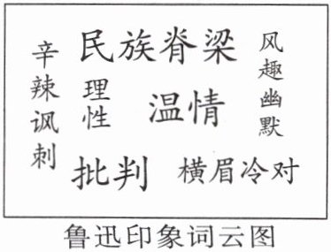 8. 新考法 进入初中以来,同学们已经学习了不少鲁迅的文章,阅读《回忆鲁迅先生》(节选)后,对鲁迅先生又有了新的认识。请你结合“鲁迅印象词云图”,从中挑选出一个关键词,并结合阅读过的鲁迅作品,说说你的理解。