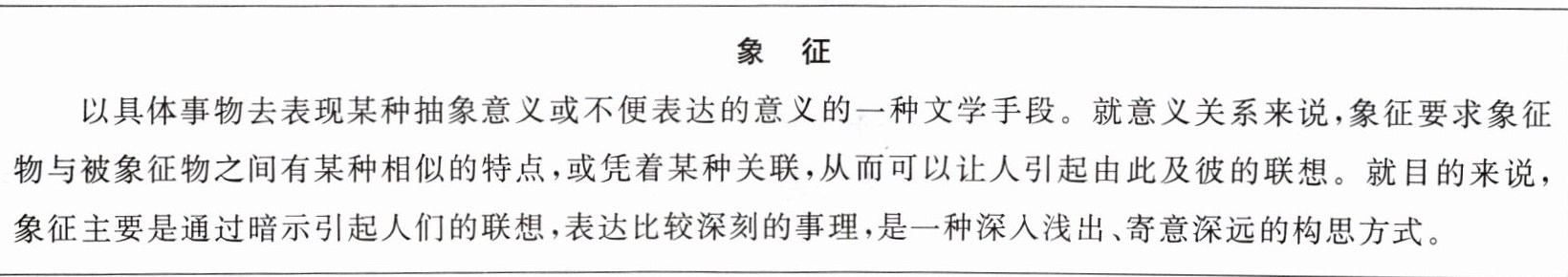 以具体事物去表现某种抽象意义或不便表达的意义的一种文学手段。就意义关系来说,象征要求象征物与被象征物之间有某种相似的特点,或凭着某种关联,从而可以让人引起由此及彼的联想。就目的来说,象征主要是通过暗示引起人们的联想,表达比较深刻的事理,是一种深入浅出、寄意深远的构思方式。