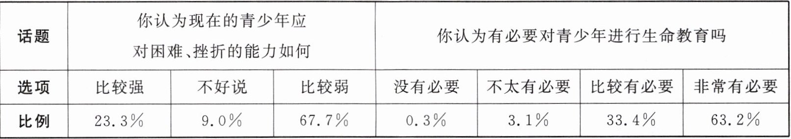 ①近七成的受访者认为现在的青少年应对困难、挫折的能力比较弱。②超过六成的受访者认为对青少年进行生命教育非常有必要。