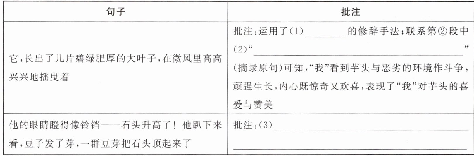 6. 语文老师布置了为文中画波浪线的句子做批注的任务,请你完成表格。