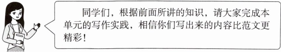 同学们,根据前面所讲的知识,请大家完成本单元的写作实践,相信你们写出来的内容比范文更精彩!
