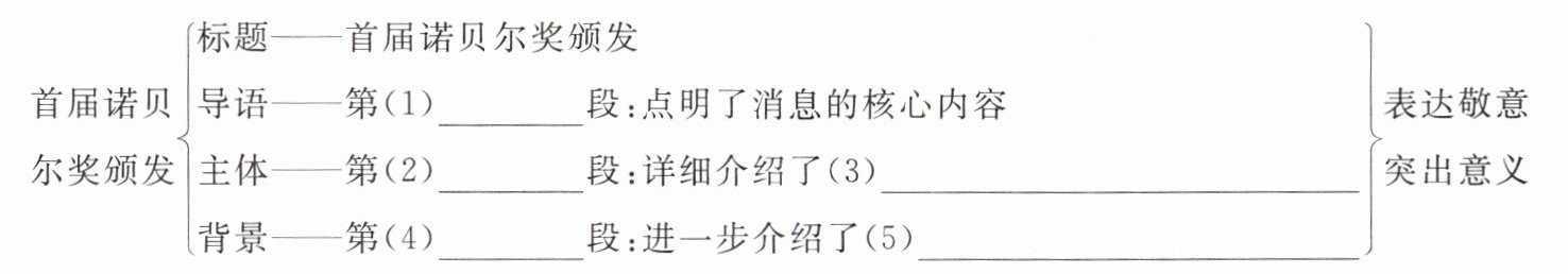 消息正文的结构通常有倒金字塔结构、时间顺序结构和并列式结构三种。其中倒金字塔结构最为常见。请概括《首届诺贝尔奖颁发》主体部分的内容并标示在下面的倒金字塔结构图中。
