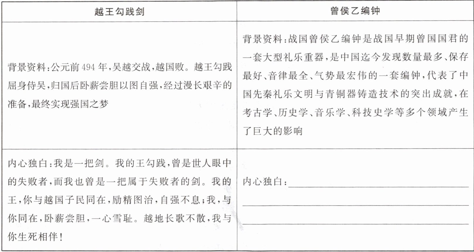 新考法 遇上“互联网十”,文物也会“开口说话”。请你参照示例,结合文本内容及历史知识,发挥想象,为曾侯乙编钟写一段内心独白,讲述它的“前尘往事”。