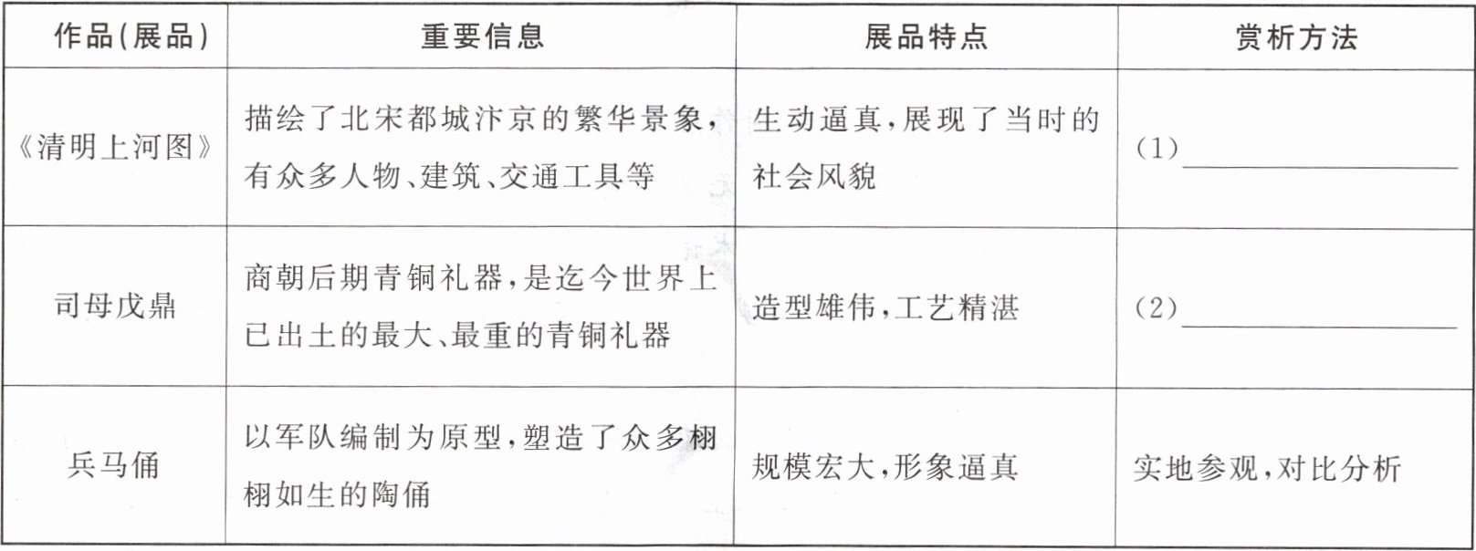 7. 跨学科学习·历史学校组织开展“探寻文化宝藏”的主题学习活动,在“展品赏析”环节中,小粤分享了他的赏析卡片(如下表)。表格中有几处遗漏的信息,请你帮他补充完整。