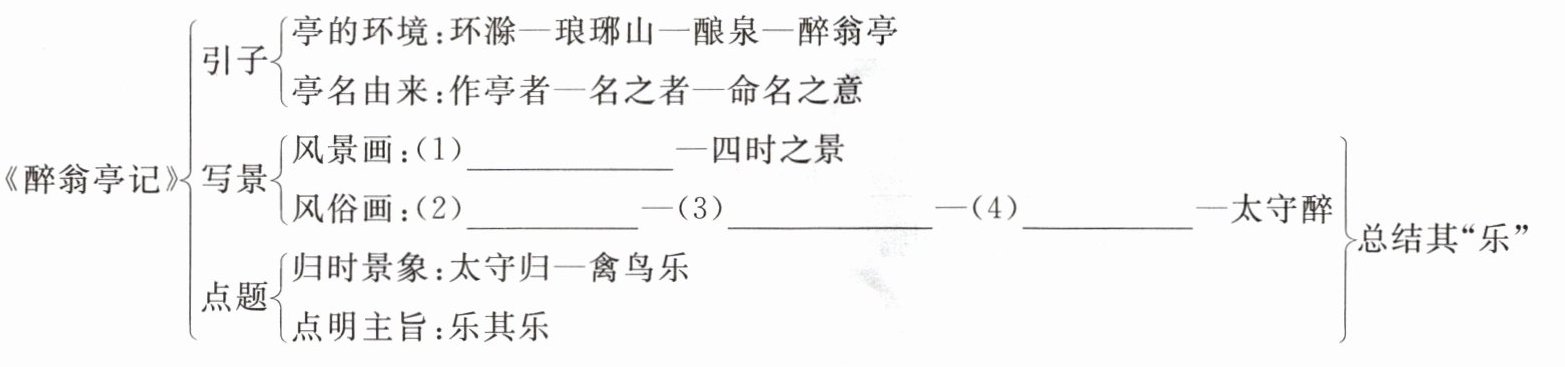 ①茂盛的样子 ②曲折,回环 ③居高面下 ④意趣,情趣 ⑤弥漫的云气 ⑥昏暗 ⑦花 ⑧茂盛 ⑨背着东西的人 ⑩在树下休息 ⑪弯腰曲背,这里指老人 ⑫牵扶,这里指被牵扶的人,即儿童 ⑬清 ⑭菜蔬 ⑮陈列,摆开 ⑯尽兴地喝酒 ⑰下棋 ⑱酒杯 ⑲倒下的样子 ⑳遮盖 ㉑以……为快乐 ㉒为,是