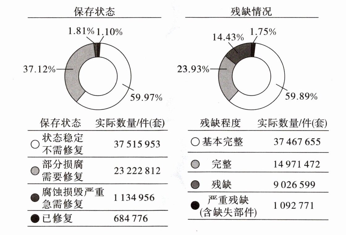 示例:我国有超过一半的可移动文物保存基本完整,状态稳定,不需要修复,但在保存过程中仍有部分文物因为各种原因需要修复,还有小部分文物处于残缺状态。