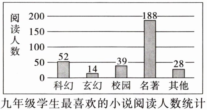 本校九年级学生阅读名著的人数远远超过阅读其他类书籍的人数;本校九年级学生阅读玄幻类书籍的人数最少。