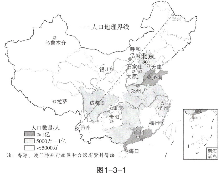 2. 人口普查结果为完善我国人口发展战略和政策体系、制定经济社会发展规划、推动高质量发展提供了准确的统计信息,有助于了解我国人口基本国情。据图1-3-1分析,可知我国省级行政区中(