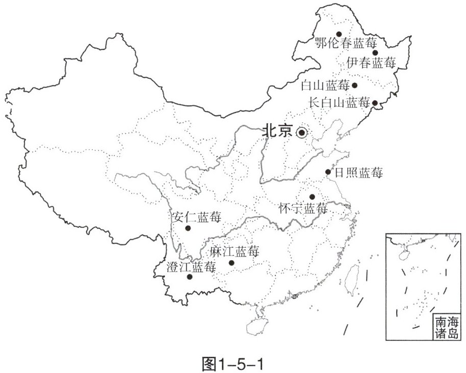 4. 蓝莓,甜酸适口,有清爽宜人的香气。图1-5-1为我国蓝莓主要产地分布图,蓝莓主要分布在下列省区中的地区是(