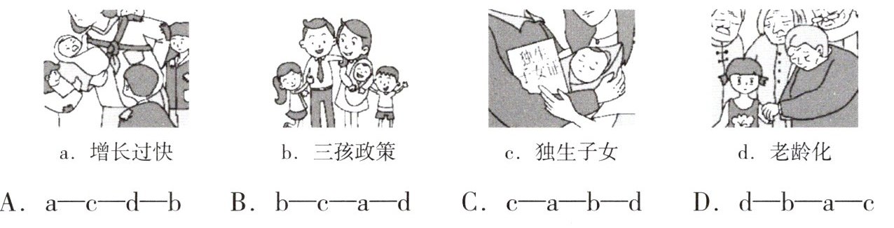 6. 如图是反映新中国成立以来不同时期的人口问题或人口政策的一组漫画。能正确反映我国人口问题及对应政策发展变化过程的排序是(