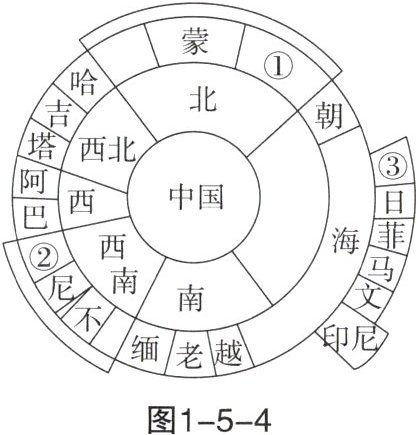12. 图1-5-4为我国邻国示意图,数字①、②、③分别代表的国家是(