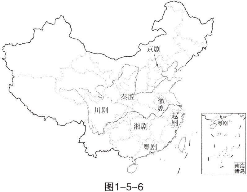 16. 中国戏曲历史悠久,剧种繁多。不同区域的戏曲特色各不相同,如北方剧最激烈高亢,南方剧清雅秀丽。图1-5-6为我国部分剧种分布图。据此完成问题。
