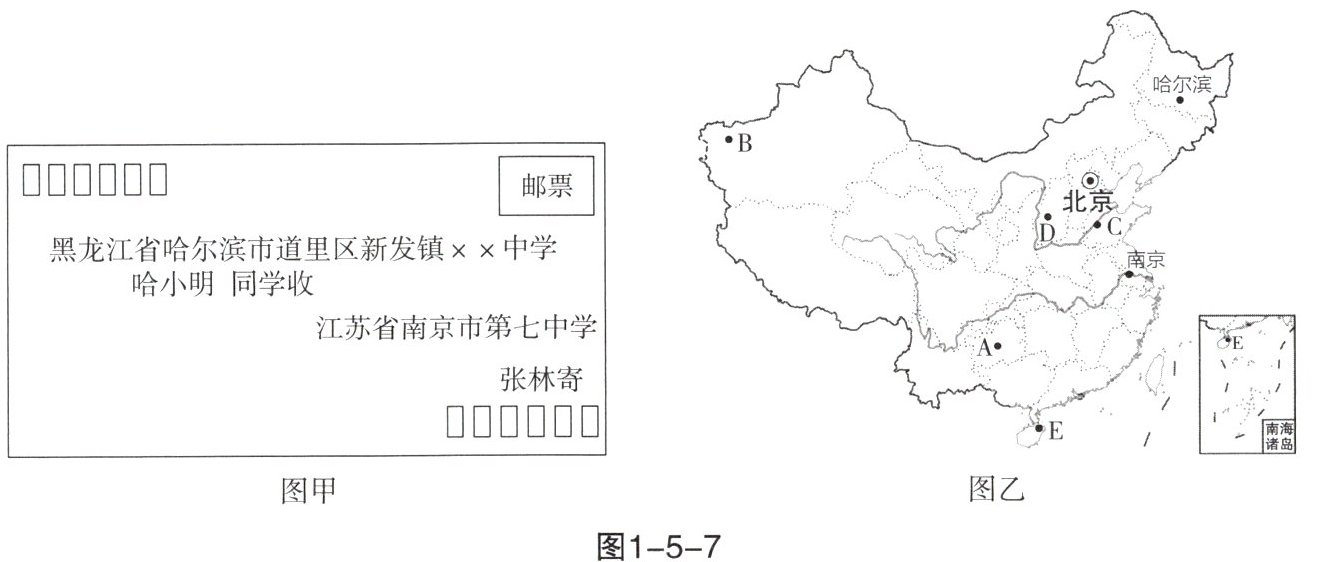 17. 某年春节期间,南京的张林给家住哈尔滨的哈小明写了一封邀请信,邀请哈小明一道参加一个假期活动。邀请信中,张林告诉哈小明参加假期活动的地方在一年中有两次太阳直射现象的某一城市。哈小明接受了邀请,并参加了假期活动,与张林、马旭、华正强、刘凯、孙双震五名同学分在一个小组。图1-5-7中图甲是哈小明收到的邀请信信封,图乙是哈小明、张林、马旭、华正强、刘凯、孙双震居住的城市和要参加的假期活动的地点分布。据此完成下列各题。