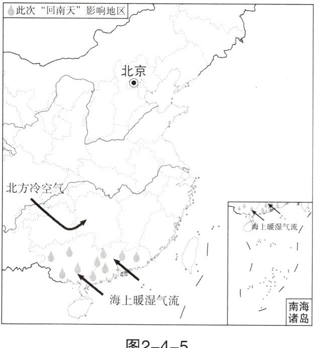 5. 回南天一般出现在2~3月,主要是因为冷空气走后,暖湿气流迅速反攻,气温回暖,湿度回升,形成连日的小雨或大雾。图2-4-5是2019年某次回南天形成示意图,该次回南天现象发生在(
