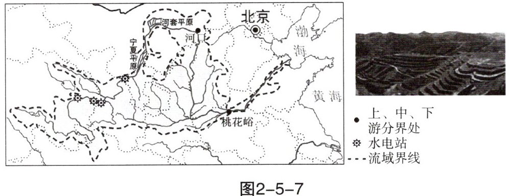 材料二 图2-5-7左为黄河流域图,右为黄土高原治理后的“绿水青山”景观图。