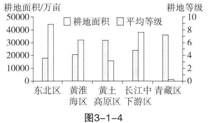 图3-1-4为我国部分区域耕地面积及平均等级结构图,耕地等级数值越小,表示耕地质量越优。读图,完成3~4题。
