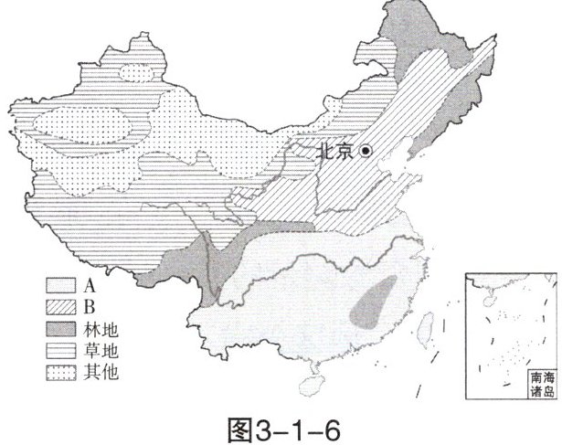 7. 读图3-1-6中国主要土地利用类型分布图,完成下列各题。