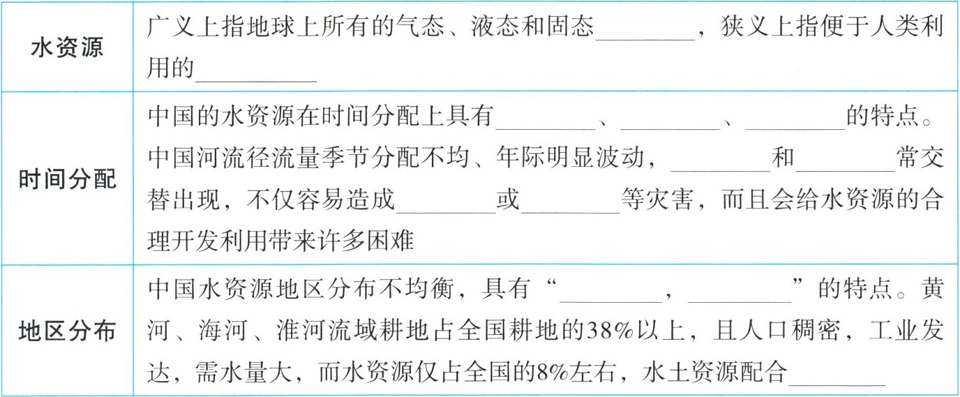 要点一:水;淡水资源;夏秋多;冬春少;年际变化大;丰水年;枯水年;洪涝;干旱;东多西少;南多北少;欠佳