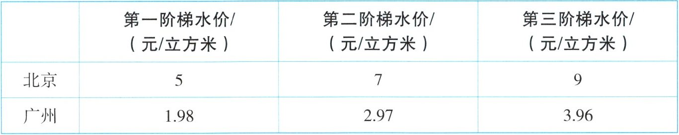 “阶梯水价”是对使用自来水实行分类计量收费和超过定额量累进加价的俗称。对比下列北京、广州“阶梯水价”表,完成1~2题。