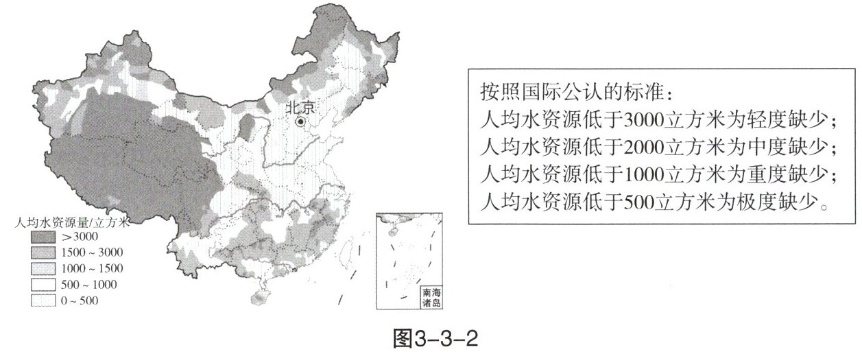 2020年9月1日起,我国对取用地表水或地下水的单位和个人试点征收水资源税。阅读图3-3-2我国人均水资源分布图,完成4~5题。