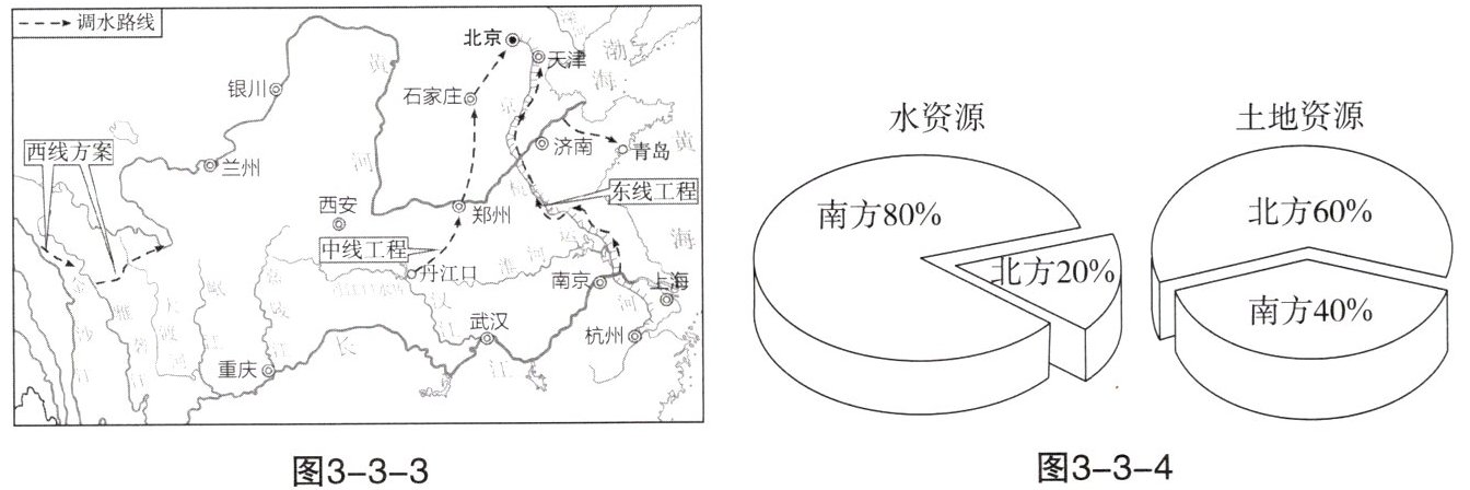 6. 读图3-3-3中国跨流域调水工程图和图3-3-4中国南北方水土资源比较图,完成下列各题。