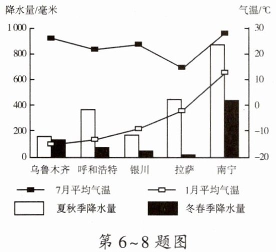 6.C 解析:气温年较差是指一年中最热月平均气温与最冷月平均气温的差值,北半球陆地上一般7月最热,1月最冷。读图可得,四城市中乌鲁木齐的气温年较差最大。7.A 8.B 解析:依据图中夏秋季和冬春季的降水量来看,乌鲁木齐降水量夏秋季稍多于冬春季。呼和浩特降水主要集中在夏秋季。银川降水主要集中在夏秋季,季节变化明显。拉萨降水季节变化大,主要集中在夏秋季节。