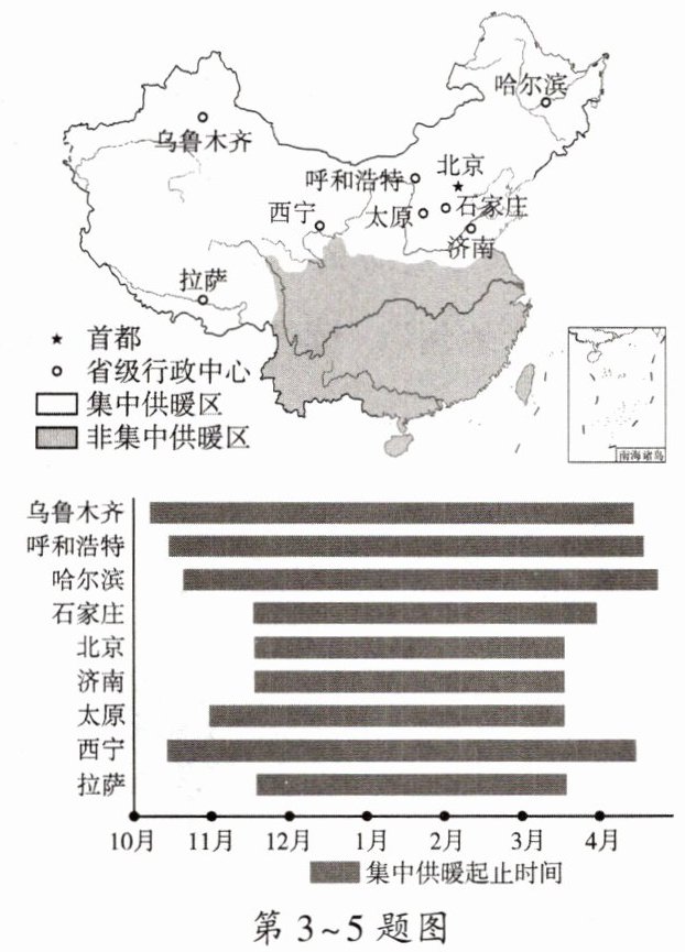 [2024·廊坊期中]集中供暖是指向建筑物供给热量,保持室内舒适温度的社会服务。如图示意我国集中供暖区分布及我国部分城市集中供暖起止时间。据此,完成3~5题。