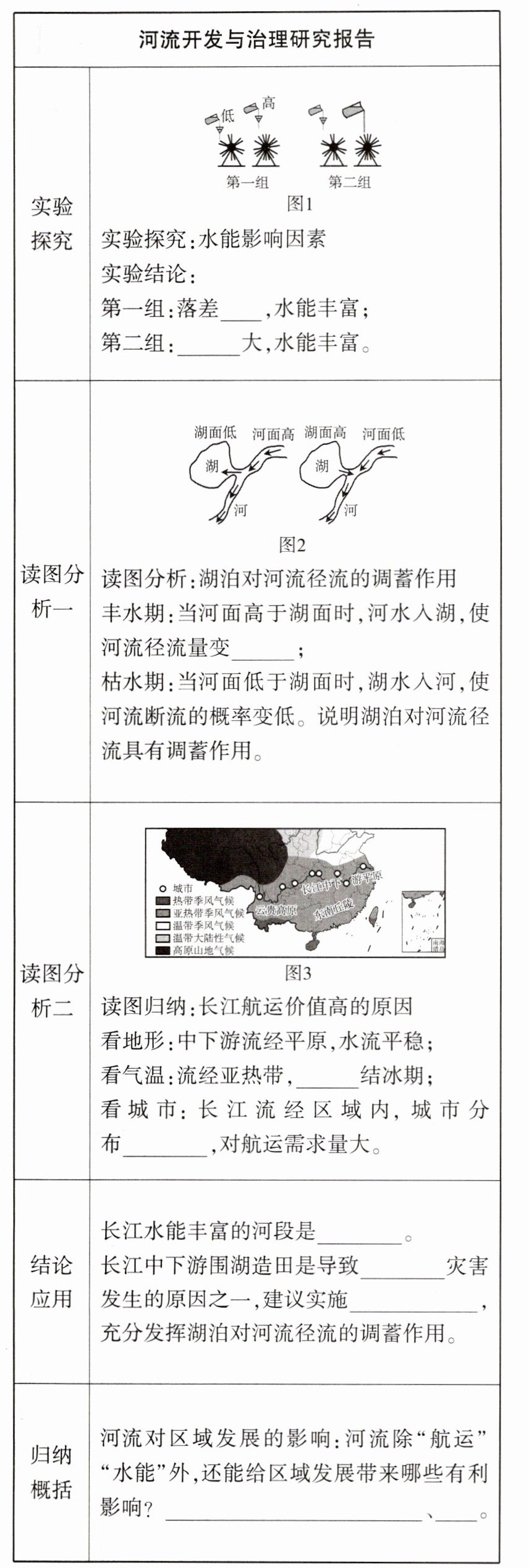 19. [2023·赤峰中考]某中学地理实验探究课,以“河流开发与治理”为主题开展学习活动。图1为水能影响因素实验示意图,图2为湖泊对河流径流的调蓄作用示意图,图3为中国局部略图。读图文资料,完成研究报告。