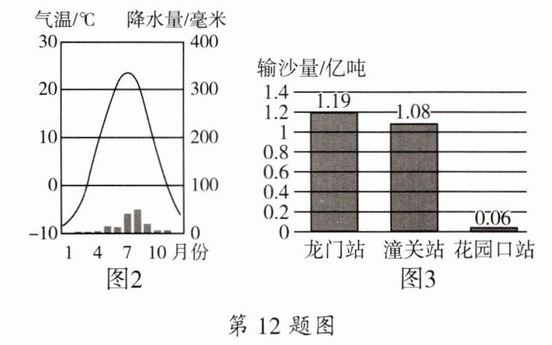 12. [2023·泉州模拟]某校学生围绕不同主题展开对黄河的探究。图1为黄河流域示意图、图2为银川气温曲线和降水量柱状图、图3为2016年龙门站、潼关站、花园口站三个水文站的输沙量统计图。阅读图文资料,回答下列问题。