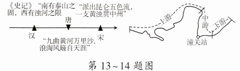 [2024·常德期末]某中学语文老师、地理老师围绕黄河的特征组织了跨学科主题学习。语文老师提供了“黄河诗文”时间轴,地理老师提供了黄河潼关站的水文资料。据此,完成13~14题。