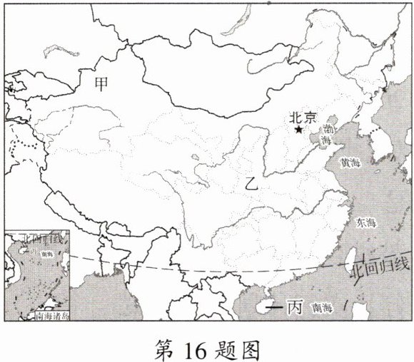 16. 生活实践[2024·西安期末]我国地域辽阔,各省自然条件差异很大,但每个人都热爱自己的家乡。甲、乙、丙三位同学开展了一次“夸夸我家乡”的比赛活动。读中国疆域图,回答下列问题。