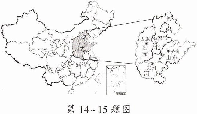 [2024·太原期末]“山河四省”是指山西、河北、山东、河南四省,位于我国北部黄河流域,地处华北平原和黄土高原的交汇地带。自古以来就是中华文明的发祥地,也是我国重要的农业大省。下图示意“山河四省”位置,据此完成14~15题。