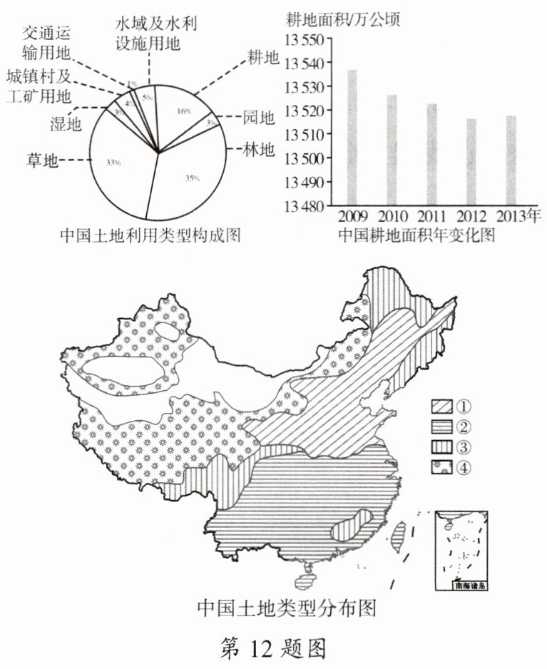 (1)我国土地利用类型齐全(多样),耕地少,林地、草地多。