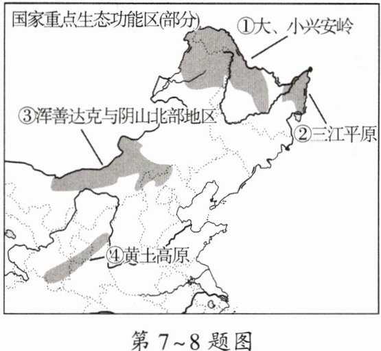 [2024·永州三模]国家重点生态功能区是指承担水源涵养、水土保持、防风固沙和生物多样性维护等重要生态功能、关系区域生态安全的区域。读我国重点生态功能区(部分)分布图,完成7~8题。