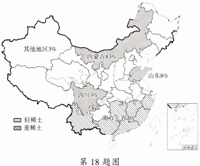 (1)我国稀土资源地区分布不均,北多南少;轻稀土主要分布于北方,重稀土主要分布于南方;北方集中分布于内蒙古和山东,南方分布较分散。