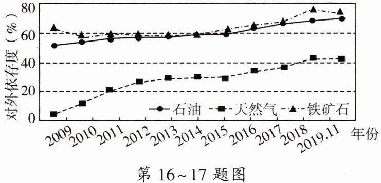目前我国部分能源和矿产资源仍需大量进口,结合我国石油、天然气、铁矿石对外依存示意图(2009年—2019年11月),完成16~17题