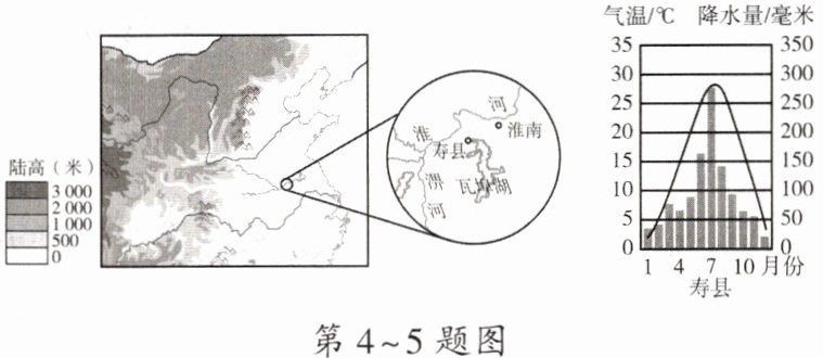 [2024·梅州期中]陂(bēi)是我国古人依地势将周边水源引至低洼地汇集成塘,在多雨期蓄水,以保障农业灌溉的小型水利工程。芍陂(què bēi,现名安丰塘)位于安徽省寿县境内,2015年入选《世界灌溉工程遗产名录》。读芍陂位置示意图及寿县多年平均各月气温和降水量图,完成4~5题。