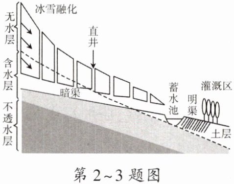 [2024·临沂期末]坎儿井集中分布在我国新疆吐鲁番地区,是我国古代劳动人民创造的地下引水灌溉工程,长期为新疆绿洲居民所利用。图为坎儿井结构示意图。读图,完成2~3题。