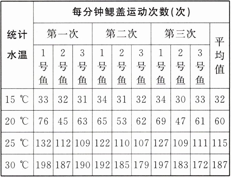 14. 核心素养·探究实践为探究水的温度对鱼呼吸频率的影响,某生物兴趣小组设计并完成了一个探究实验。相关数据记录如下: