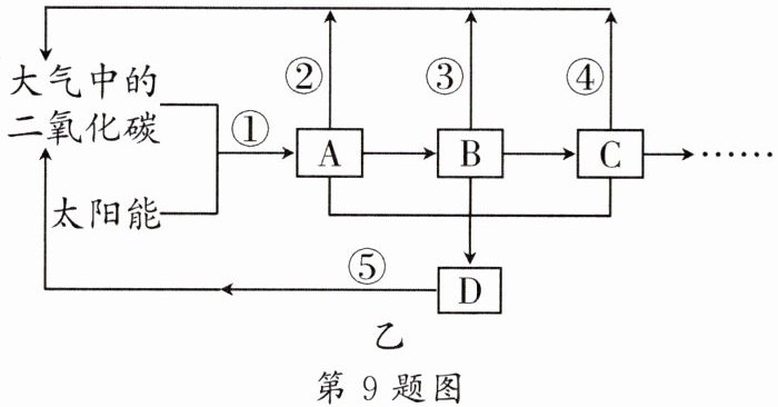 9. [2024·滨州]为确定某湖泊中几种生物之间的捕食关系,研究者分析了动物消化道内的食物成分,结果如甲所示;如图乙是整个湖泊的碳循环和能量流动示意图,①~⑤表示有关生理过程。请回答下列问题。