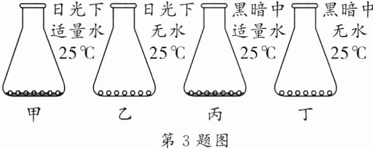3. 核心素养·探究实践[2023·云南]为探究影响种子萌发的外界条件,某实验小组利用蚕豆种子设计了如图实验(除探究条件外,其他条件相同且适宜)。一段时间后,只有甲组、丙组种子萌发,且萌发率相近。该实验表明蚕豆种子萌发需要(