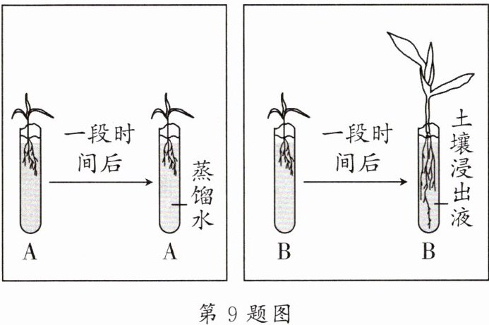 9. 某同学想要验证“植物的生活是否需要无机盐”,于是将两株同样大小的玉米苗分别放在盛有等量蒸馏水和土壤浸出液的试管中培养。实验结果如图,下列分析正确的是(