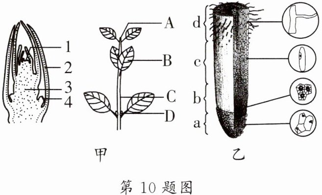 10. 图甲是叶芽的结构及发育成的枝条,图乙是根尖结构,据图回答下列问题。