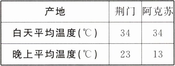 13. 新疆的阿克苏冰糖心苹果味甜多汁,皮薄肉厚,质地较密,含糖量高,被称为“新疆的水果皇后”,有人把这种苹果引种到荆门种植,结出的苹果品质却不同。在果树生长期间,两地光照条件和管理措施相同,但昼夜温度有一定差异(如表)。经测定,阿克苏苹果的含糖量明显高于荆门产的苹果,对此现象的解释,错误的是 (