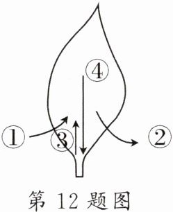 12. 如图是某种树叶的外形,图中①②③④分别代表不同的物质,箭头表示物质进出的方向。请据图回答下列问题。