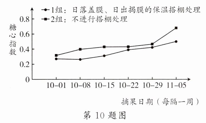 10. [2023·陕西]小秦知道了新疆哈密瓜甜的原因后,想探究夜间温度对苹果含糖量(“糖心指数”越高,含糖量越高)的影响,于是在家人的帮助下,选取同一果园长势相近的果树,分两组进行探究。依据如图可得出的结论是 (