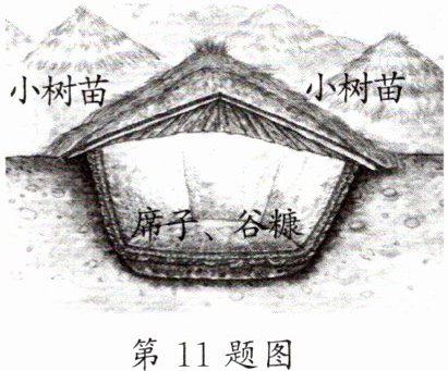 11. 跨学科·生物与传统文化 [2024·泸州]历经隋、唐、北宋的“含嘉仓”是中国古代最大的粮仓,储有粟、大豆等种子,有“储粮千年而不腐”之功效。含嘉仓仓顶栽有小树苗,仓底铺有席子、谷糠等物质,其仓窖复原模式图所示,下列有关推测不合理的是 (