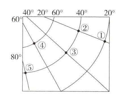 A. 图中五个点位于低纬度的是①,位于高纬度的是⑤