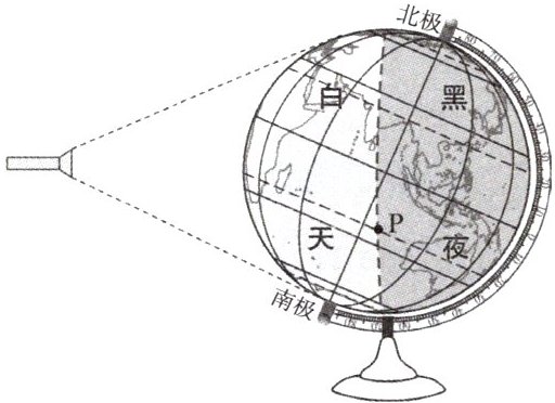 在暗室里用电灯作为光源,照射地球仪,自西向东拨动地球仪,演示地球自转运动,如图所示。据此完成5~6题。